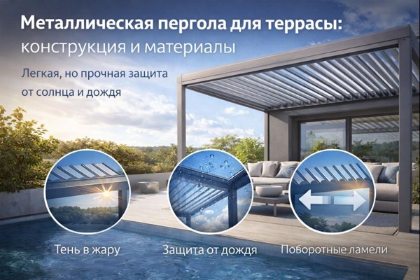 Металлическая пергола для террасы представляет собой современное и функциональное решение для обустройства открытых пространств. Использование стали или алюминия обеспечивает прочность и долговечность конструкции, а продуманные инженерные решения позволяют адаптировать её к различным погодным условиям.